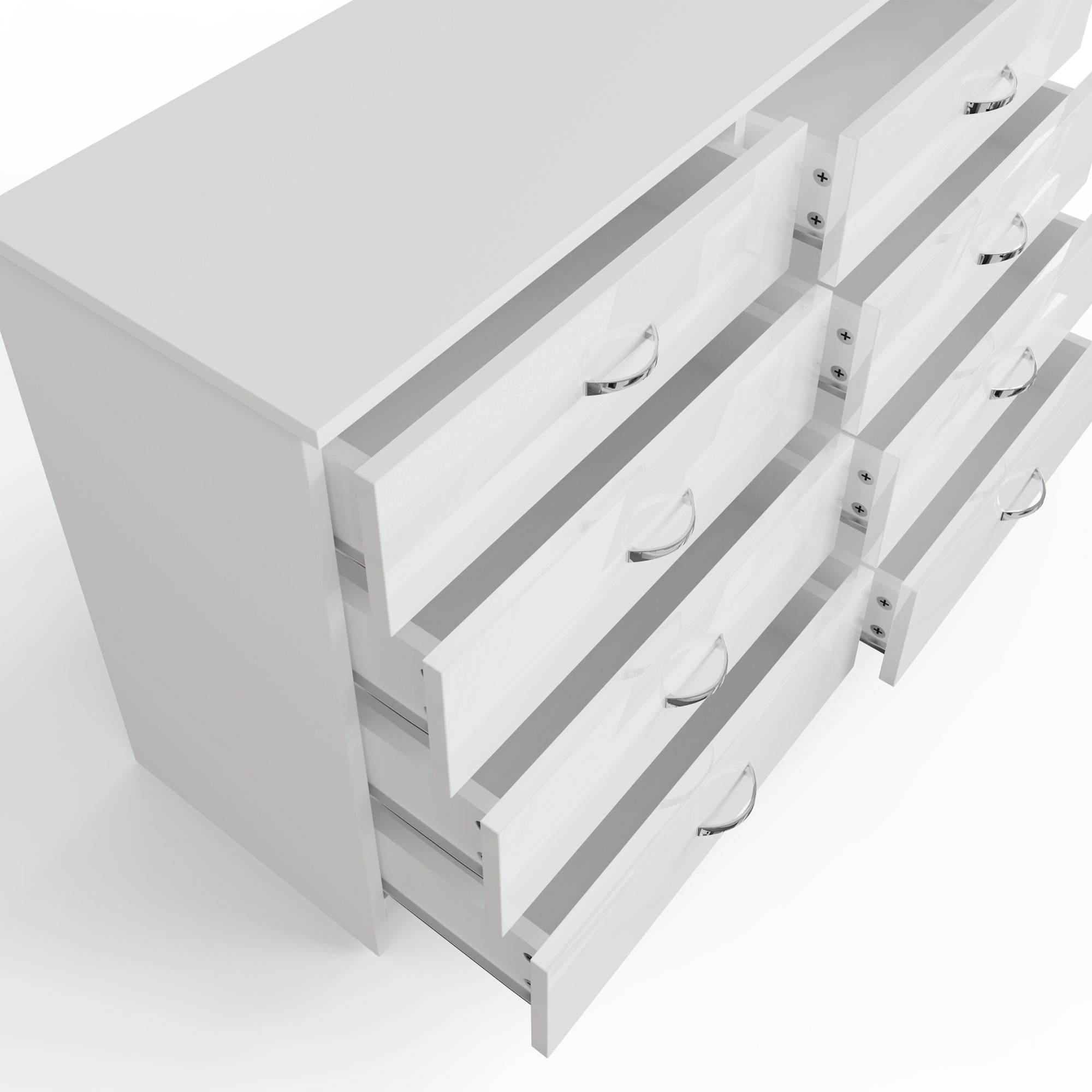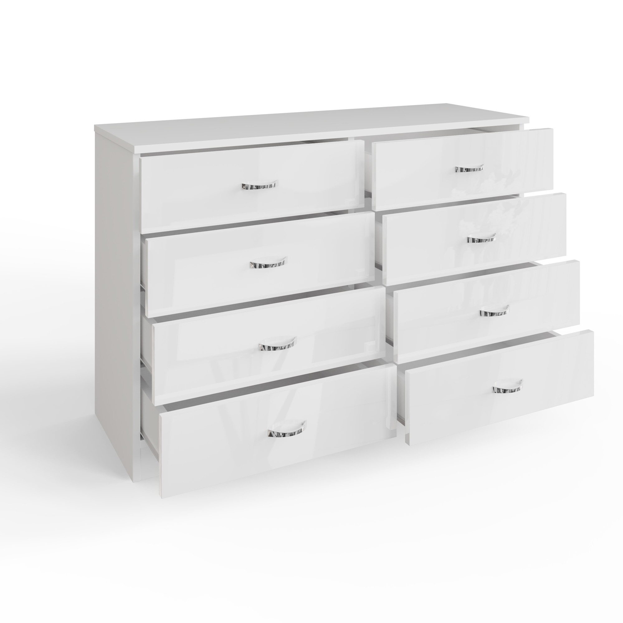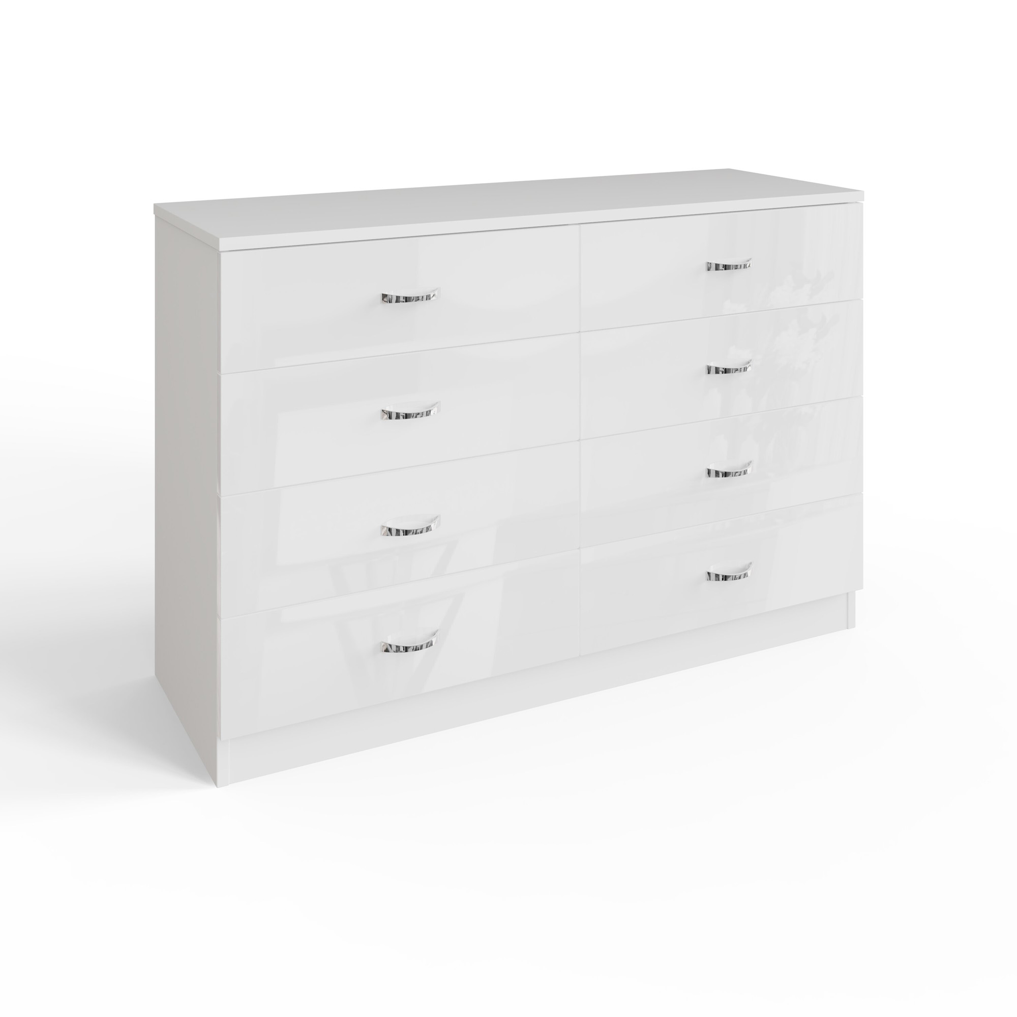 The Chilton 8 Drawer Wide Chest Of Drawers in White Gloss is a substantial piece perfect for those who need extensive storage without compromising on style. This chest features a unique 4+4 drawer layout, providing ample space with four wide drawers on each side. Each drawer showcases a lustrous white gloss finish, while the frame has a contrasting matte finish, creating an elegant visual appeal. With a drawer depth of 10 cm, this chest is ideal for storing a variety of items from clothing to bedding. Built to last, its scratch-resistant surface ensures durability and enduring beauty.