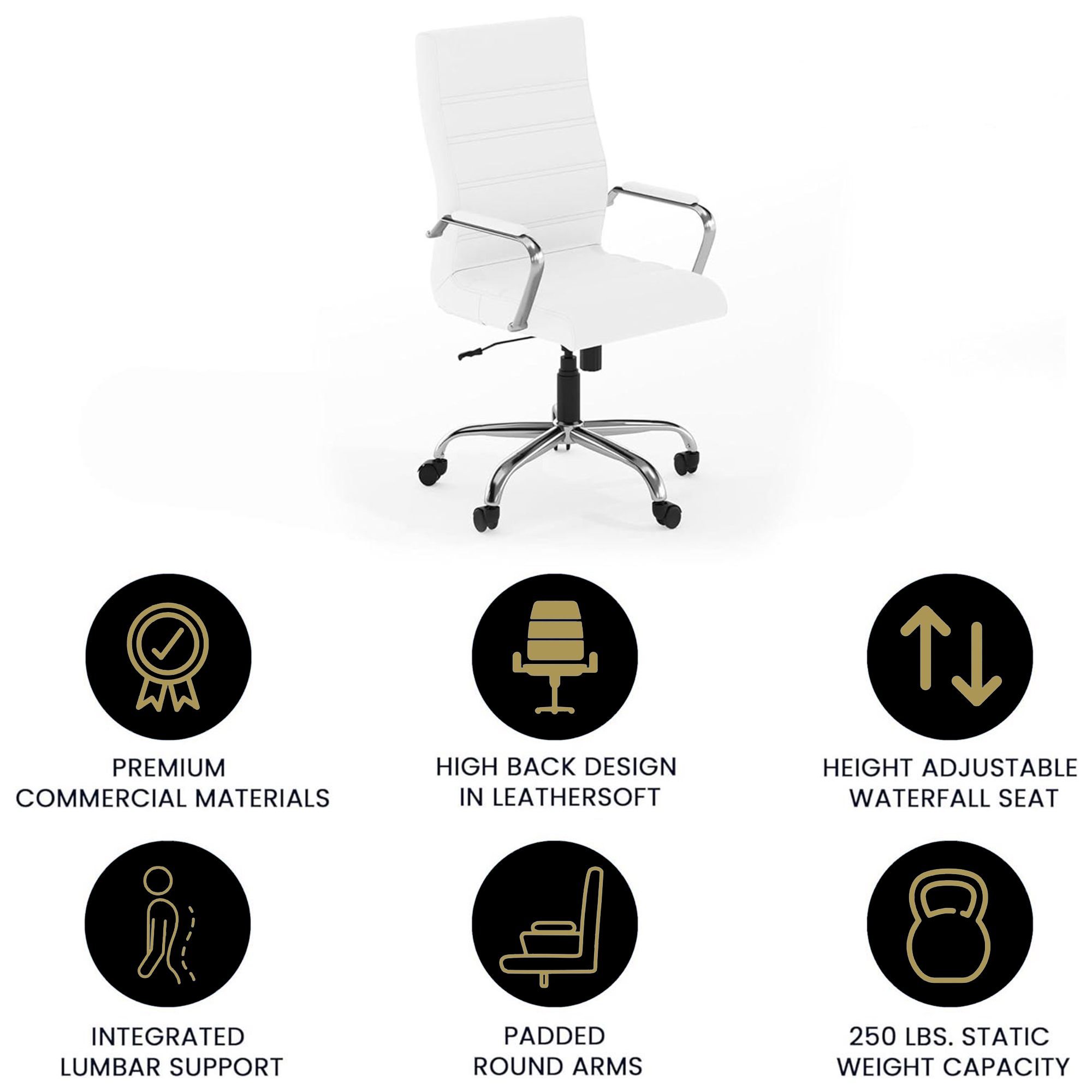 The chair features a mid back design that provides excellent lumbar support while promoting natural posture. Upholstered in smooth white faux leather, the padded seat and backrest offer both comfort and sophistication, while the horizontal stitching detail adds a refined finish. The combination of white faux leather with chrome metal accents gives this executive office chair a luxury inspired look that enhances any modern interior.