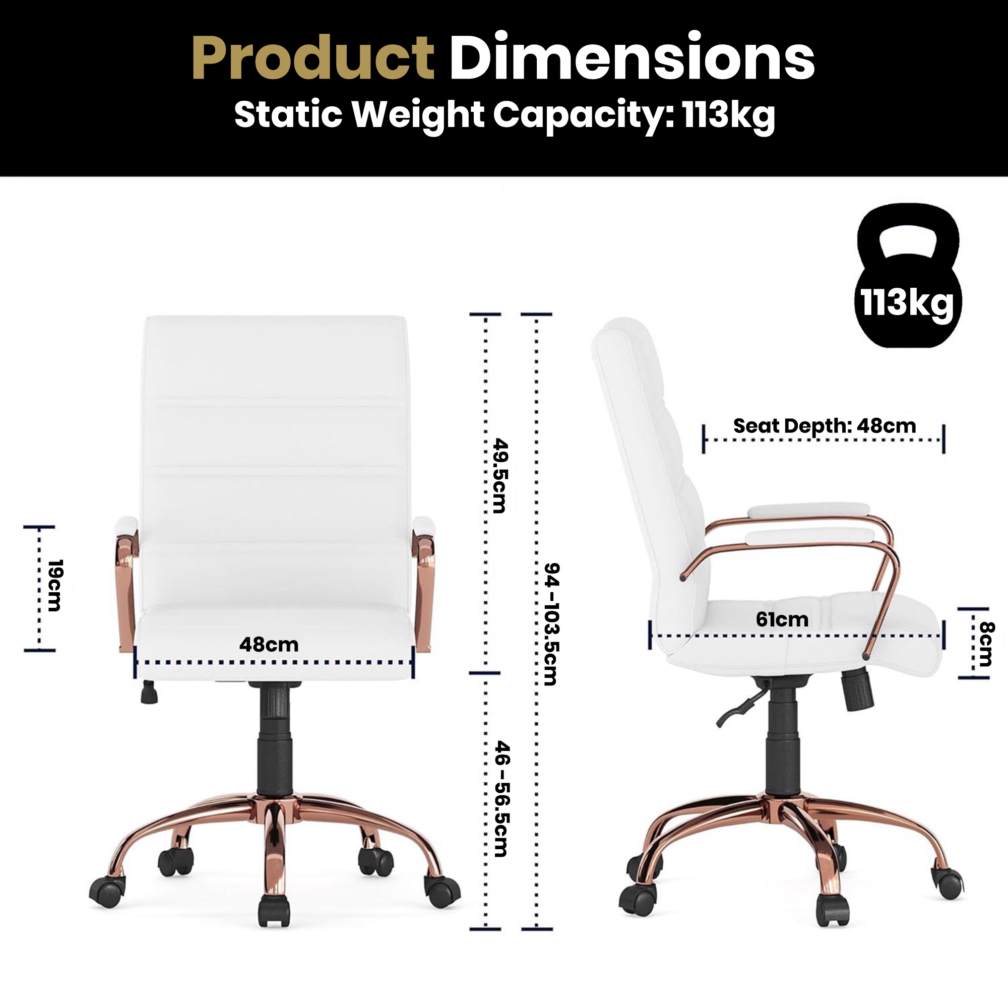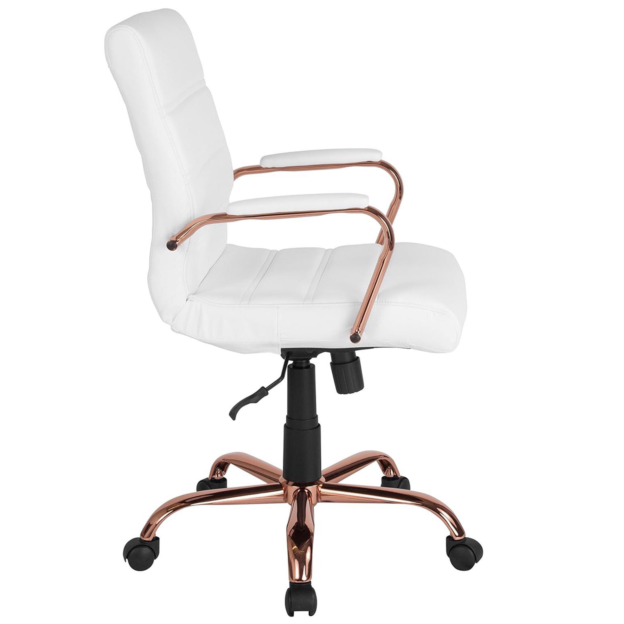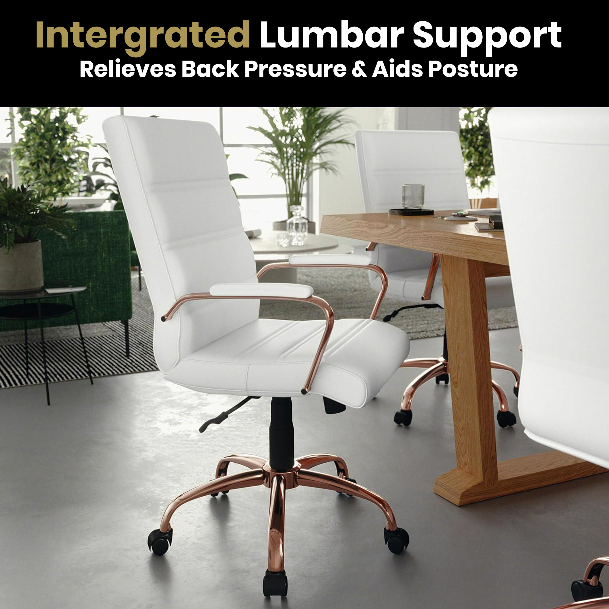 The chair features a mid-back design that provides excellent lumbar support while promoting natural posture. Upholstered in smooth white faux leather, the padded seat and backrest offer both comfort and sophistication, while the horizontal stitching detail adds a refined finish. The combination of white faux leather with rose gold metal accents gives this executive office chair a luxury-inspired look that enhances any modern interior.